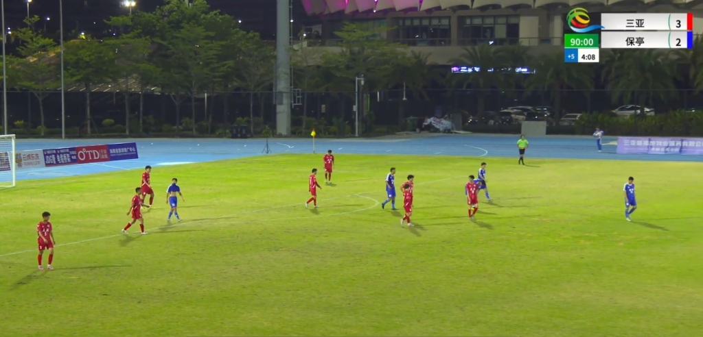 进球情况:第13分钟,保亭队73号李锦硕;第38分钟,三亚队72号陈颖;第54分钟,三亚队9号金建华;第89分钟,三亚队10号张哲林;第90+1分钟,保亭队83号王小康。