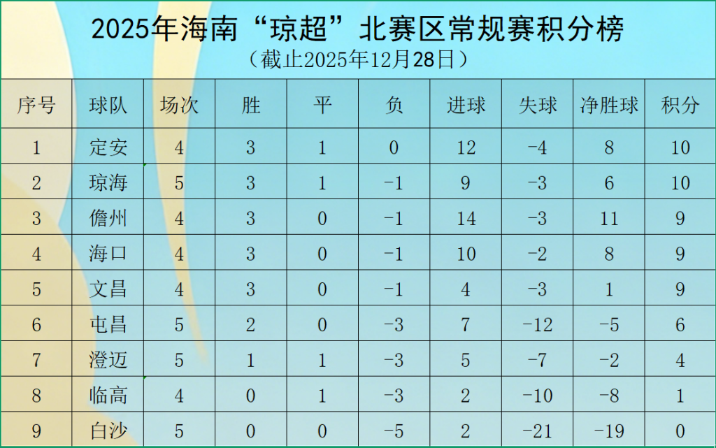 北赛区方面,积分榜竞争尤为激烈。定安队在与临高队的较量中,虽一度领先却被对手连追两球,最终 2:2 战平,此役后定安队以 4 战 3 胜 1 平积 10 分的战绩位列北赛区榜首;儋州队则展现强劲进攻火力,8:0 大胜白沙队,凭借 4 战 3 胜积 9 分的表现紧随其后;海口、文昌两队同积 9 分,与儋州队共同构成北赛区第二梯队;琼海队本轮 3:0 击败屯昌队,5 战 3 胜 1 平积 10 分,与定安队并列积分榜首;白沙队 5 战全负积 0 分,暂居北赛区末位。