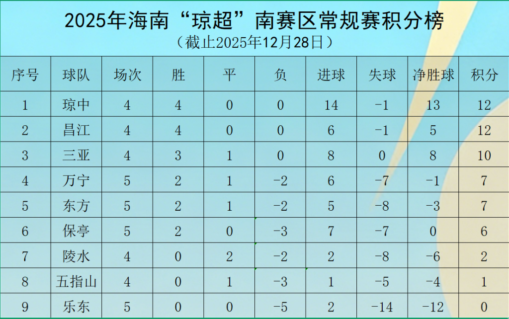 (截止琼超第五轮战罢,即截止2025年12月28日)